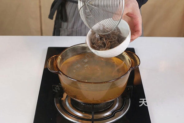 2.毛肚焯水1分钟捞出沥干,放在黄瓜丝上;