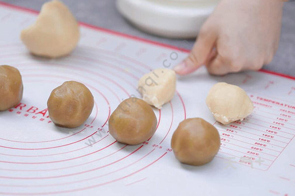 3.莲蓉40g、蛋黄1个包好备用,饼皮分10份,取一份压扁,把馅料放在中间,用虎口位置向上推捏紧收口滚圆。
