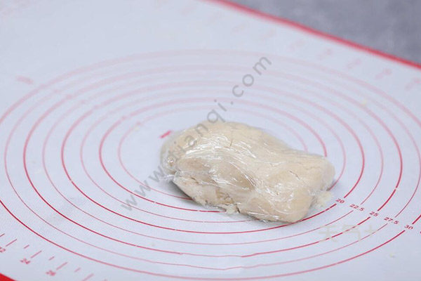 2.倒入面粉,用刮刀拌至无干粉状态,放入保鲜袋扎紧、室温松弛2个小时。