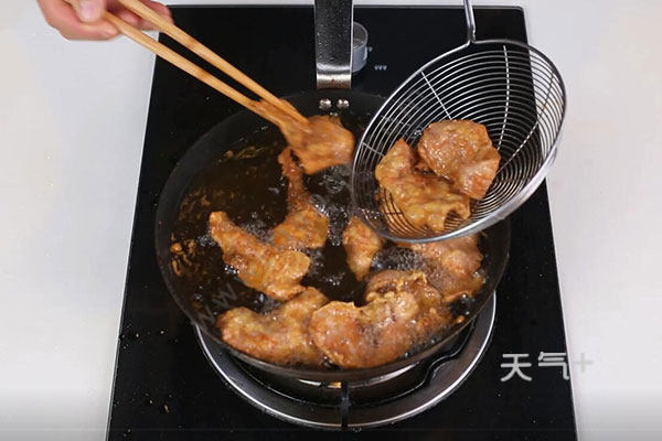 3.油温烧至6成热,依次下入鱼片炸至金黄,捞出待用。