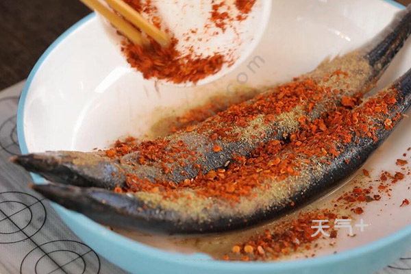 2.孜然粉、黑胡椒粉、辣椒粉倒入秋刀鱼中抹匀,腌制4小时。秋刀鱼怎么做好吃 香煎秋刀鱼的做法
