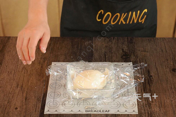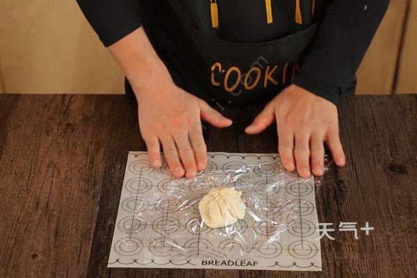 3.将发酵的面团用擀面杖擀开,放入鸡蛋液,把面饼两边粘合成包子的形状,再用保鲜膜盖住,过一会儿再取出擀平。