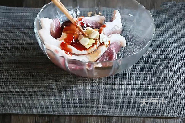 2.梅花肉中加入叉烧酱2勺,酱油1勺,蚝油1勺,蜂蜜2勺,白酒半勺,姜片,葱段,蒜片拌匀,腌制2小时。