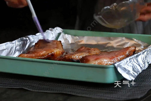 5.取出翻面,刷上蜂蜜水,继续烤16分钟,取出再次刷上蜂蜜水,叉烧肉的做法 怎么做叉烧肉再烤3分钟。烤好后取出,稍微放凉后切片即可。
