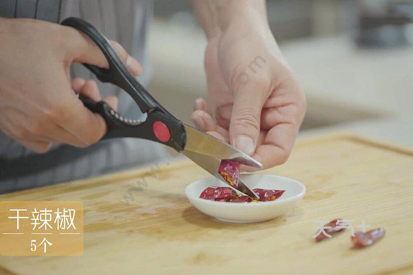 1.包菜洗净撕成小块待用,大蒜1瓣切末,干辣椒5个切段备用。