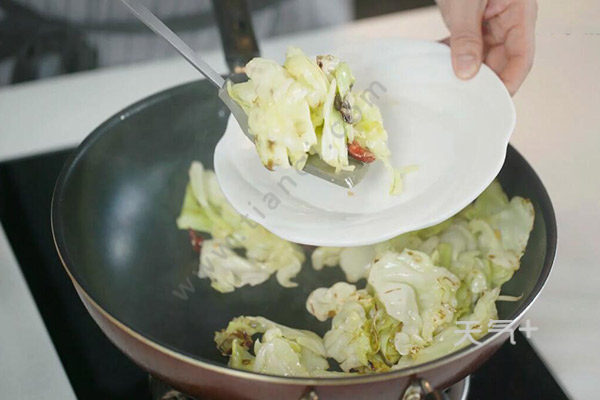 包菜洗净撕成小块待用,大蒜1瓣切末,干辣椒5个切段备用,锅中倒入适量油,油温烧至7成热,放入蒜末、辣椒段爆香,倒入包菜翻炒至包菜变软,加入盐一勺,鸡精一勺,继续翻炒一分钟即可出锅。