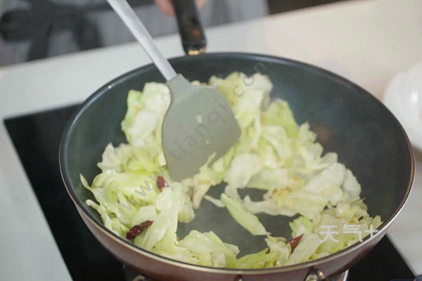 2.锅中倒入适量油,油温烧至7成热,放入蒜末、辣椒段爆香,倒入包菜翻炒至包菜变软。
