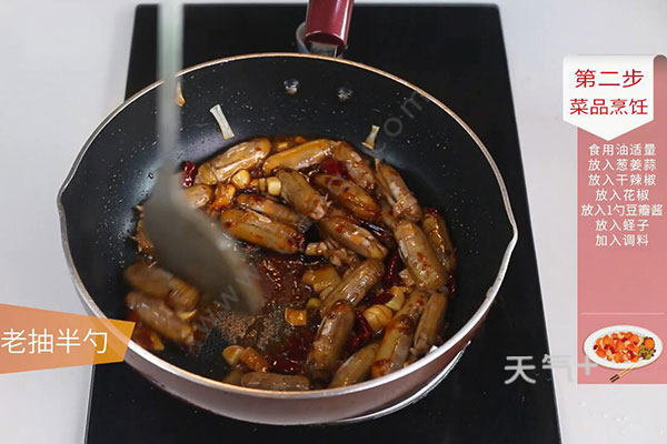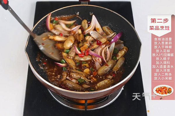 2.锅中放入适量油,油温烧至7成热,放入葱姜蒜、干辣椒、花椒、豆瓣酱1勺炒香,放入蛏子炒匀,加入料酒1勺、生抽1勺、老抽半勺、清水适量小火焖煮至断生;