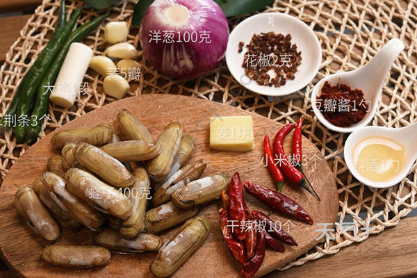 辣炒蛏子的做法 辣炒蛏子怎么炒蛏子放清水中,加盐、食用油浸泡1小时,洋葱切条,姜切片,蒜切粒,油温烧至7成热,放葱姜蒜、干辣椒、花椒、豆瓣酱炒香,放蛏子炒匀,加料酒、生抽、老抽、清水小火焖煮至断生,放洋葱、二荆条、小米椒翻炒1分钟,放盐、鸡精、白糖炒匀即可。