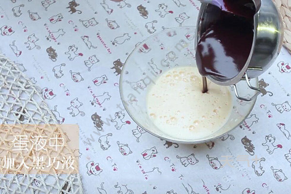 2.将鸡蛋与糖混合,打发至变白,在鸡蛋液中加入黑巧液,混合拌匀。