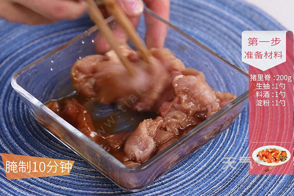 1.猪里脊洗净切小片,放入生抽1勺,料酒1勺,淀粉1勺,拌匀腌制10分钟;