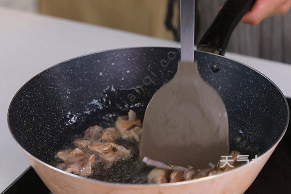 3.油温烧至6成热,放入肉片炒至变色,盛出待用;