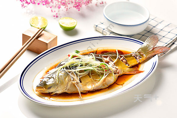 7.蒸好的鳊鱼上铺上姜丝、红椒圈和葱丝,
