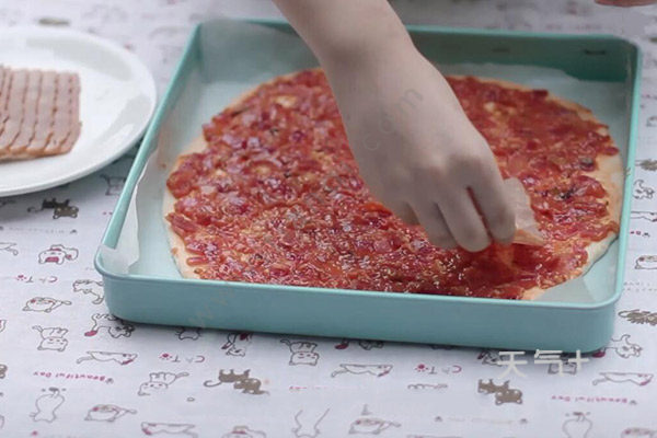 4.面团排气擀开,静置二十分钟后用叉子扎孔,铺上炒好的酱。