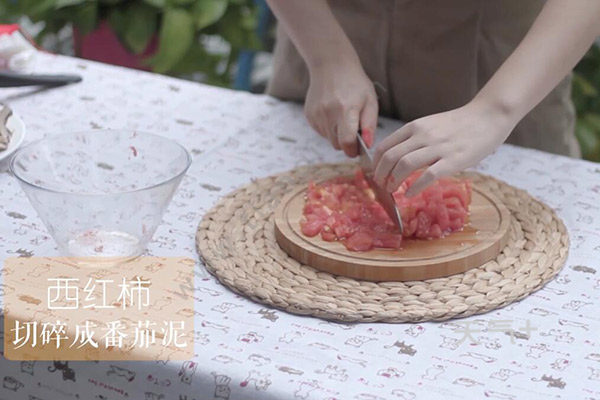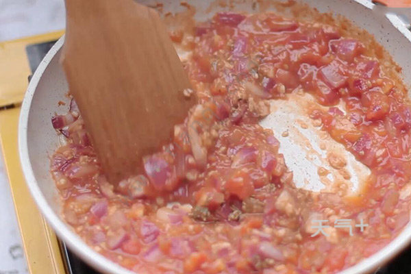 3.锅中倒适量油放入蒜末、洋葱末、番茄泥,翻炒一会倒入番茄酱。放香料、盐、糖炒匀盛出备用。