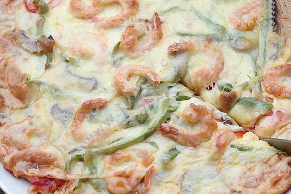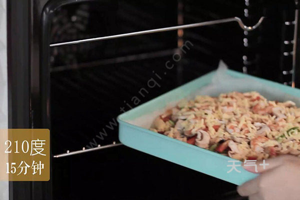 5.放上培根、芝士、青红椒、蘑菇、虾仁,最后上面再铺上一层芝士,放入烤箱210度烤15分钟就好了。