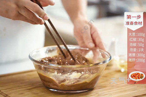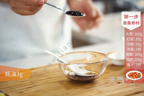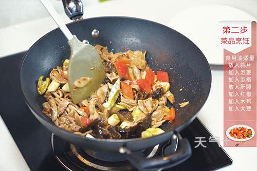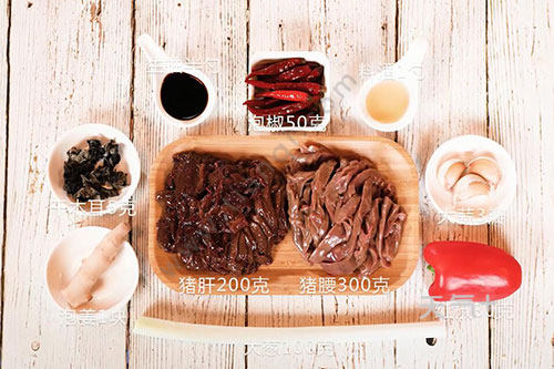 1、猪腰洗净,腰花洗净横向斜刀切片(注意底部不能切断)切好后竖向切片(前刀不切断,第三刀再切断)。猪肝洗净切薄片。干木耳放入温水中泡发,撕成小朵。大葱斜刀切片,红椒切小块。蒜3瓣切片,泡姜1块切片,泡椒50克切碎;