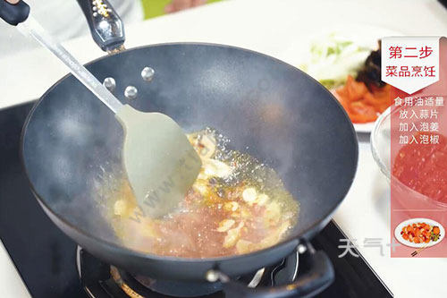 4.锅内放入适量油,油温烧至7成热,放入泡姜、蒜片、泡椒爆香;