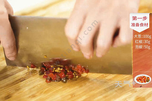 大葱100克,红椒30克,干木耳5克,泡椒50克,泡姜1块,蒜3瓣,鸡蛋黄1个,盐半勺,胡椒粉1克,生抽半勺(加老抽2克),料酒半勺;