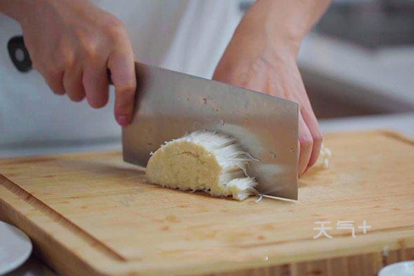 2.然后撕成小束后洗净,锅中放入适量水烧开,放入金针菇汆烫至断生,捞出沥干,将培根铺平,放入金针菇卷起,用牙签固定。