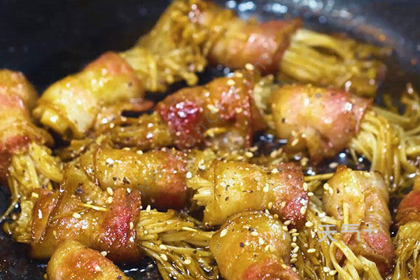 金针菇切去根部,然后撕成小束洗净,金针菇放锅里汆烫至断生,捞出沥干,培根铺平,放金针菇卷起,油温烧至7成热,放培根卷小火煎制,放生抽、蚝油、水淀粉、芝麻油拌匀,撒上黑胡椒粉、白芝麻即可。