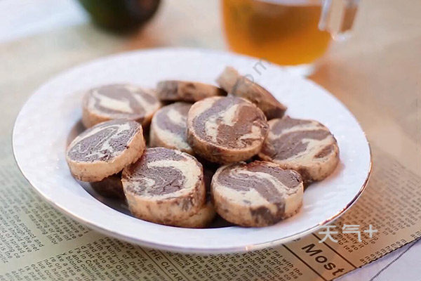 黄油打发变白后加入糖,再搅打均匀,加入牛奶打发,筛入低粉并翻拌,取一半筛入可可粉并翻拌,两个再混合揉匀,接着包上保鲜膜并冷冻,取出切片再烘培,到时再取出即可。