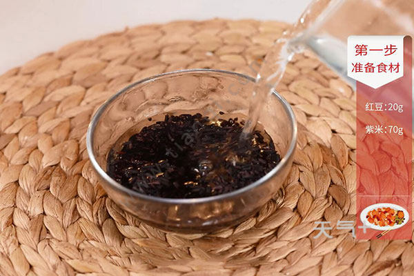 紫米70克,红豆20克,花生20克,红枣5粒;