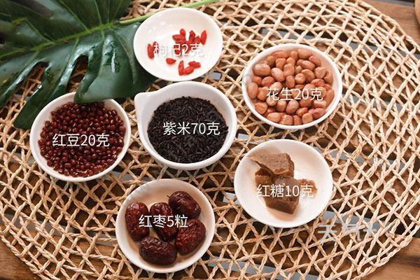 四红补血粥的做法 四红补血粥怎么做红豆洗净浸泡6小时,紫米洗净浸泡30分钟,花生、红枣、枸杞洗净,锅中水烧开,放红豆煮开,小火熬煮10分钟,放紫米、花生米、红枣继续熬煮40分钟;3.放枸杞、红糖煮10分钟,拌匀后出锅。