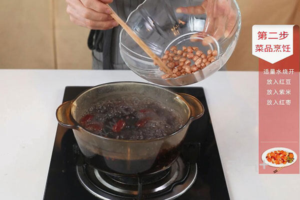 2.锅中放入适量清水烧开,放入红豆煮开后,小火熬煮10分钟,放入紫米、花生米、红枣继续熬煮40分钟,期间不定时搅拌,防止糊锅;