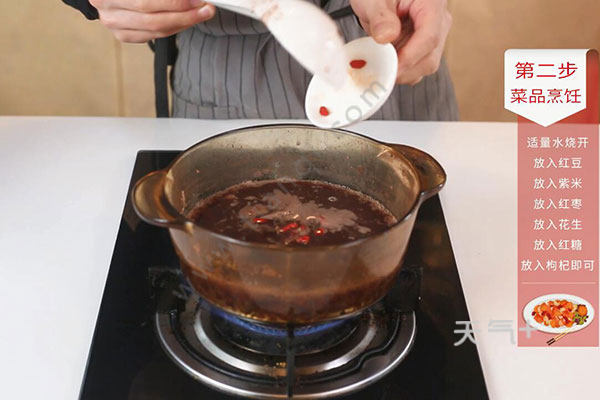3.放入枸杞、红糖煮10分钟,拌匀后即可出锅。