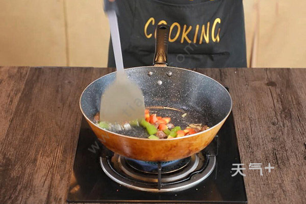 3.油温烧至6成热,放入姜蒜末炒香,放入牛肉炒至变色,放入莴笋、胡萝卜炒匀。