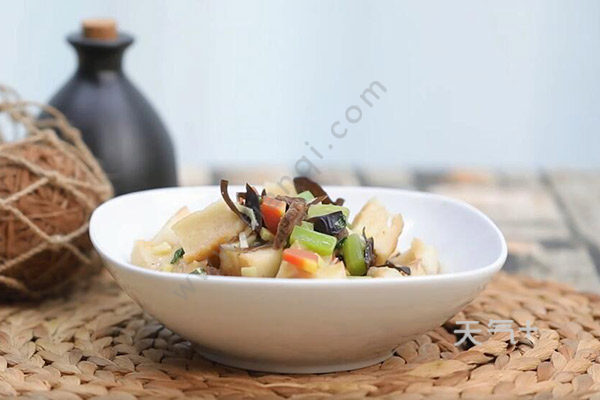 2.馍切丁,胡萝卜切丁,莴笋切丁,木耳切小块,姜切末,蒜切末,香菜切碎。牛肉泡馍的做法 牛肉泡馍的家常做法