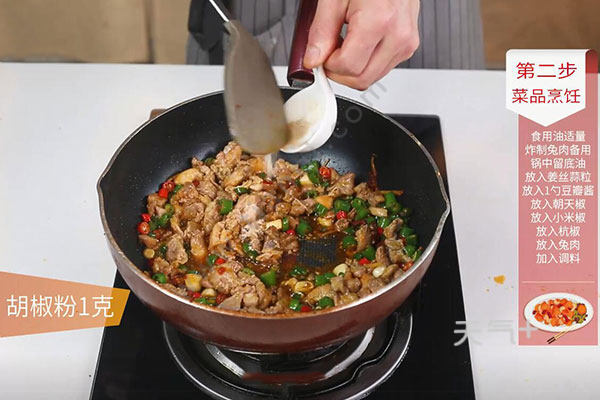 兔肉洗去血水捞出,加盐、胡椒粉、生抽、料酒、鸡蛋,拌匀后放淀粉,青朝天椒切粒、小米椒切粒,杭椒切粒,油温烧至7成热,放兔肉炸制3-5分钟捞出,留底油,放姜丝、蒜粒、青花椒、豆瓣酱炒香,放朝天椒、小米椒、杭椒炒匀,加兔肉炒匀,调盐、白糖、胡椒粉,放醋炒匀即可。