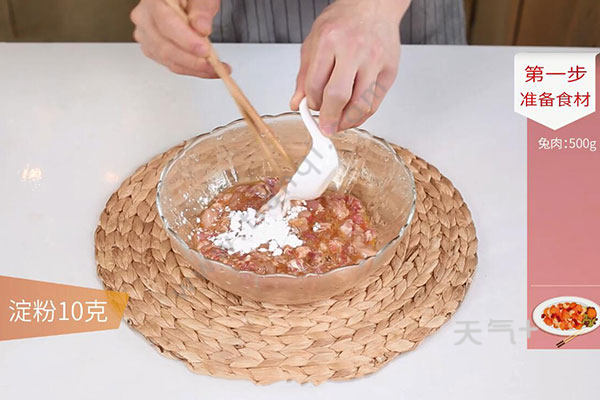 1.兔肉放入清水中洗去血水,捞出控干水分,加入盐1勺、胡椒粉1克、生抽1勺、料酒1勺、鸡蛋1个,拌匀后放入淀粉10克。青朝天椒切粒、小米椒切粒,杭椒切粒,大葱切粒,姜切丝,蒜切粒;
