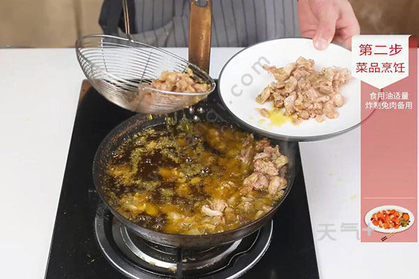 2.锅中放入适量油,油温烧至7成热,放入兔肉,炸制3-5分钟,捞出控油;