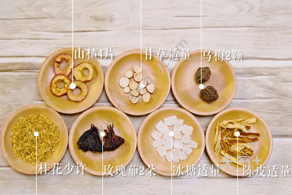 山楂4片,甘草适量,乌梅2颗,桂花少许,玫瑰茄2朵,冰糖适量,陈皮适量