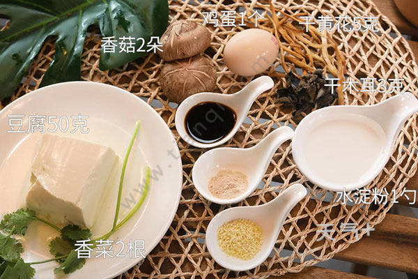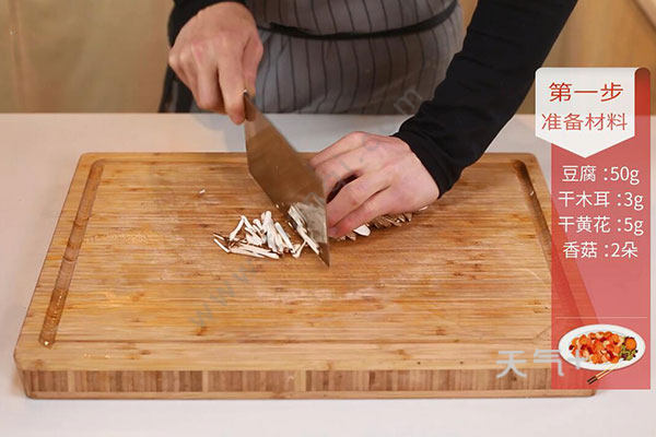 豆腐50克,干木耳3克,干黄花5克,香菇2朵,鸡蛋1个,香菜2根;