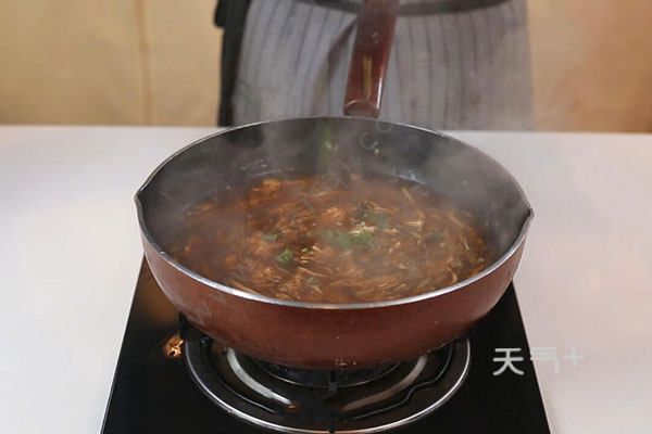3.锅中放入适量水烧开,放入老抽半勺、盐1勺、水淀粉、蛋液拌匀。加入豆腐、黄花、木耳、香菇煮开,放入醋、胡椒粉、鸡精半勺拌匀,淋上香油,撒上香菜即可出锅。