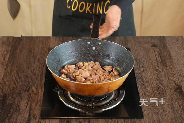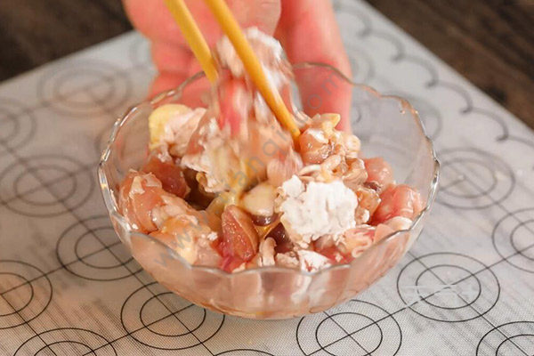 1.鸡腿肉洗净切丁,加入盐半勺、老抽2克、料酒半勺、胡椒粉1克拌匀,加入淀粉半勺拌匀腌制5分钟。