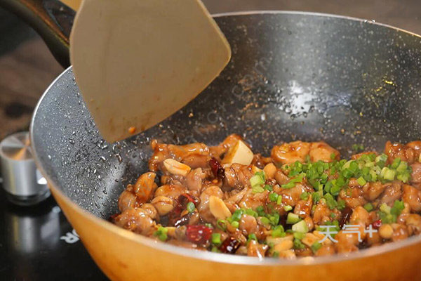 5.锅中留底油,爆香干辣椒、花椒、姜蒜粒,放入鸡丁炒匀,倒入调好的料汁炒至浓稠,倒入花生米、葱段拌匀即可。
