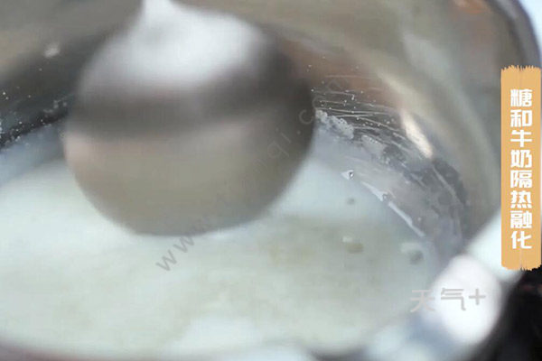 1.首先加入糖和牛奶隔热充分融化。