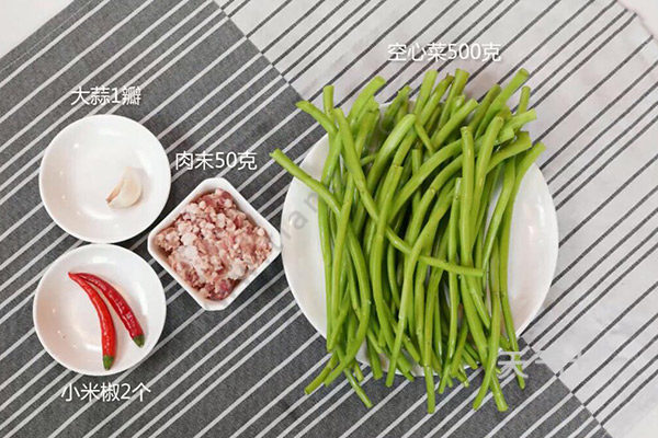 空心菜500克,肉末50克,小米辣2个,姜5克