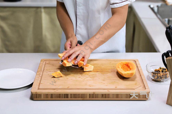1.木瓜对半切开,去皮、去掉中间的木瓜子,切成2厘米的方块,红枣对半切开,姜1块切片。