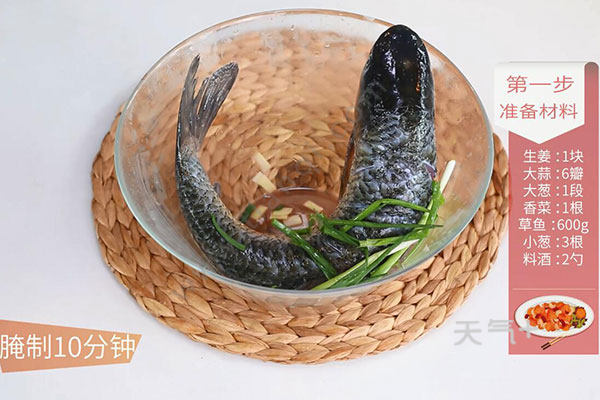 2.草鱼洗净,在鱼身两面各切4刀,放入小葱挤出葱汁,姜片、料酒2勺拌匀腌制10分钟,用厨房纸巾吸干水分,拍上一层薄淀粉。