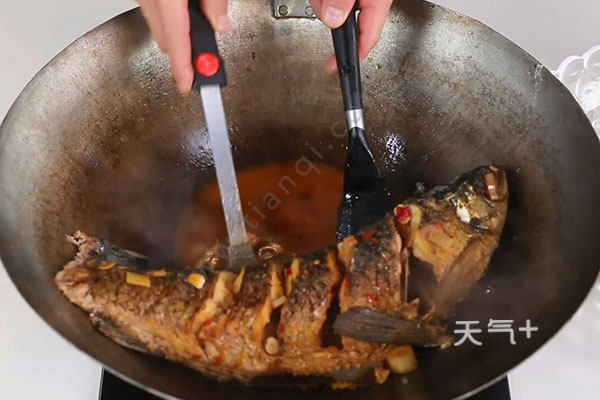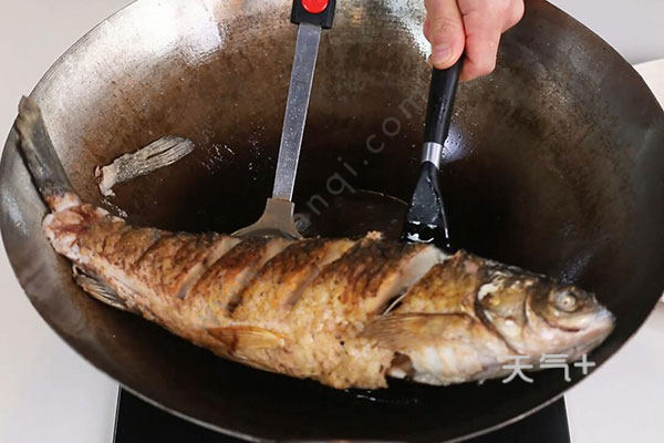3.油温烧至6成热,放入草鱼煎至两面金黄,捞出沥干。