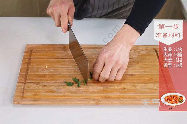 1.姜切片,蒜切粒,大葱切段,香菜切段。