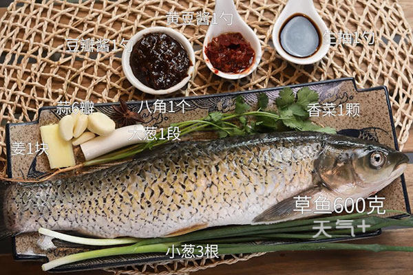 姜切片,蒜切粒,大葱切段,草鱼鱼身两面各切4刀,放葱汁,姜片、料酒腌制10分钟,拍上一层淀粉,油温烧至6成热,放草鱼煎至两面金黄捞出,留底油,爆香豆瓣酱、黄豆酱、八角、姜片、蒜粒、葱段,放盐、生抽、老抽、醋、料酒、白糖、清水煮2分钟,放草鱼焖煮15分钟即可。
