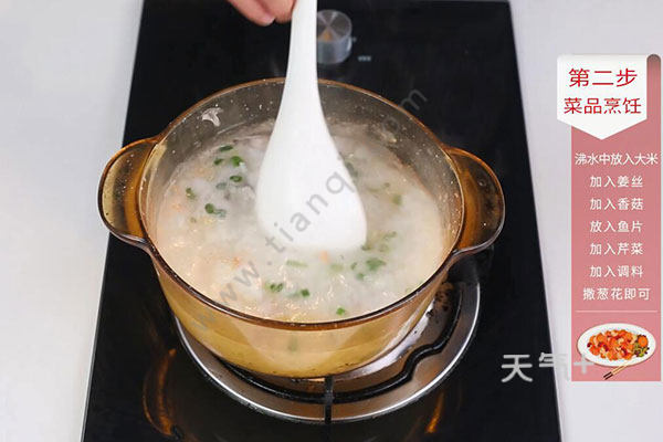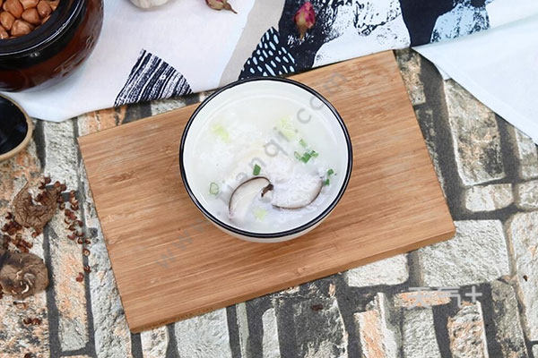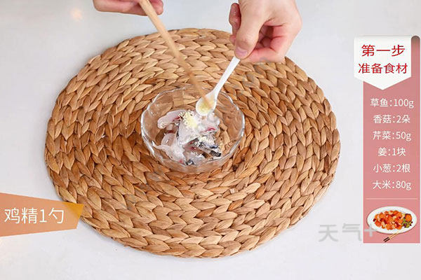 草鱼切片,香菇切片,芹菜切丁,大米浸泡30分钟,鱼片中放盐、鸡精、胡椒粉、料酒腌制5分钟,沸水中放大米、姜丝、香菇小火熬煮30分钟,放鱼片、芹菜继续煮10分钟,放盐、鸡精、胡椒粉、葱花拌匀即可。