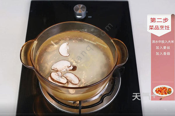 3.沸水中放入大米、姜丝、香菇,转小火熬煮30分钟,期间不定时搅拌,防止糊锅。