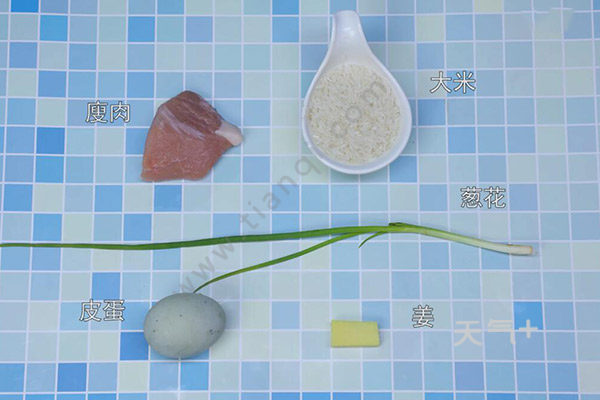 1.大米放入清水浸泡,皮蛋切丁瘦肉切碎,姜切丝,小葱切葱花。